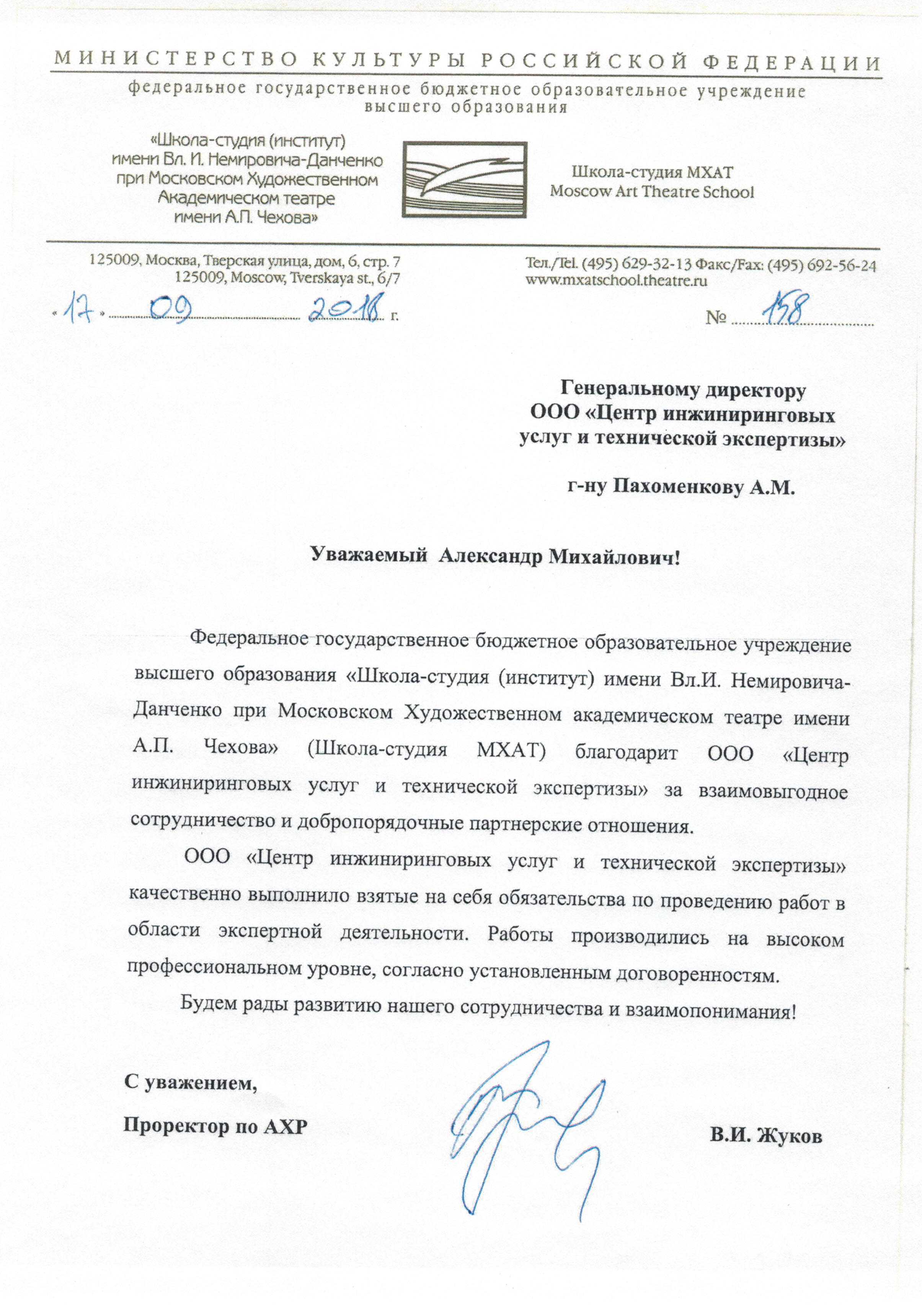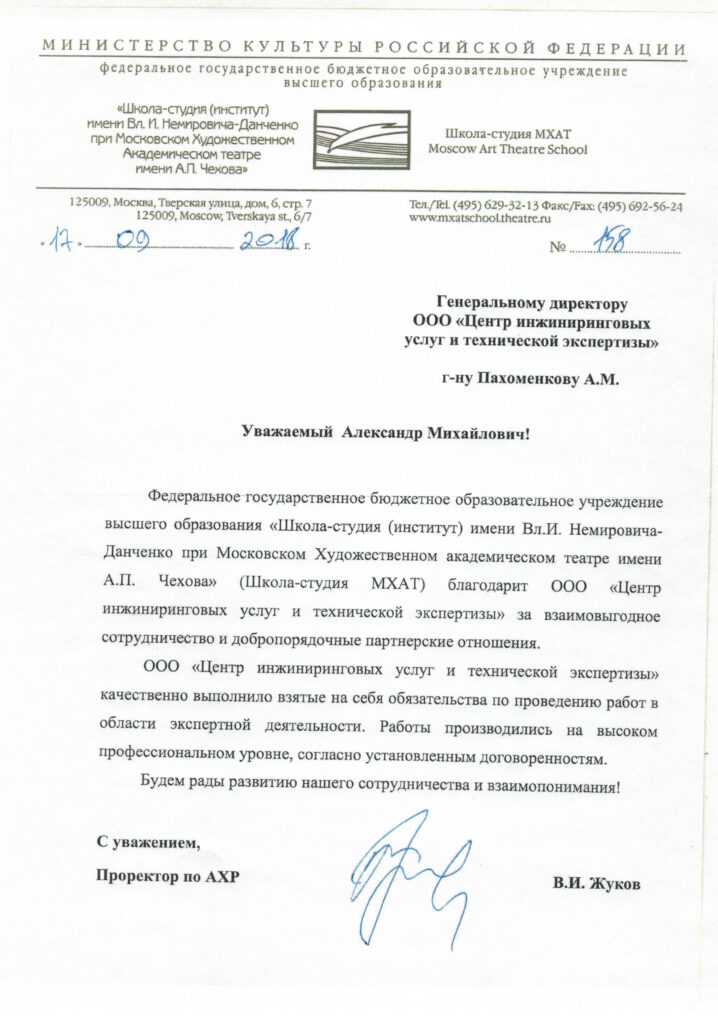 Федеральное государственное бюджетное образовательное учреждение «Школа-студия (институт) имени Вл. И. Немировича-Данченко при Московском Художественном академическом театре имени А. П. Чехова» (Школа-студия МХАТ» благодарит ООО «Центр инжиниринговых услуг и технической экспертизы» за взаимовыгодное сотрудничество и добропорядочные партнёрские отношения.
