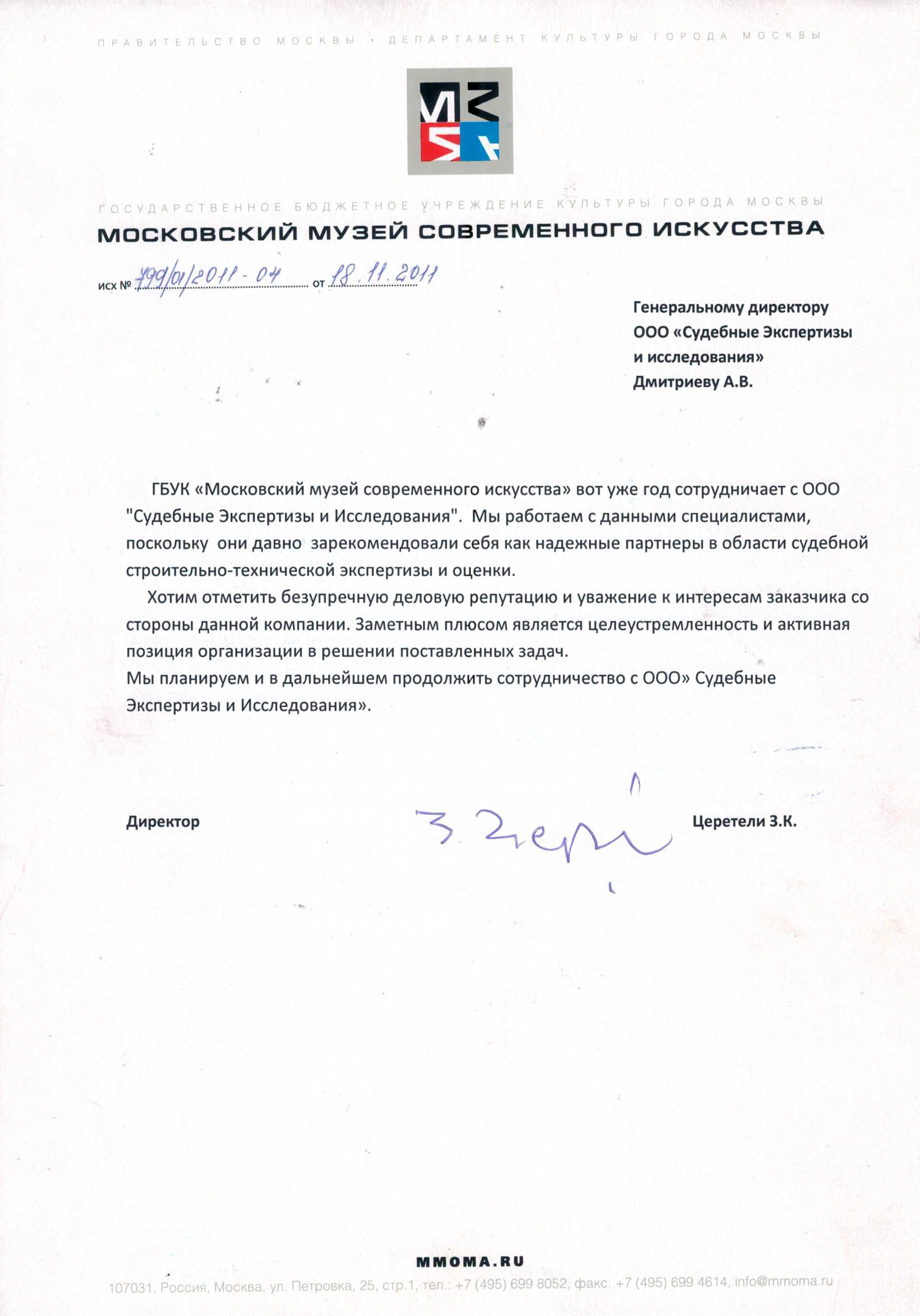 ГБУК «Московский музей современного искусства» вот уже год сотрудничает с ООО «Судебные Экспертизы и Исследования». Мы работаем с данными специалистами, поскольку они давно зарекомендовали себя как надежные партнеры в области судебной строительно-технической экспертизы и оценки. Хотим отметить безупречную деловую репутацию и уважение к интересам заказчика со стороны данной компании. Заметным плюсом является целеустремленность и активная позиция организации в решении поставленных задач. Мы планируем и в дальнейшем продолжить сотрудничество с ООО» Судебные Экспертизы и Исследования».