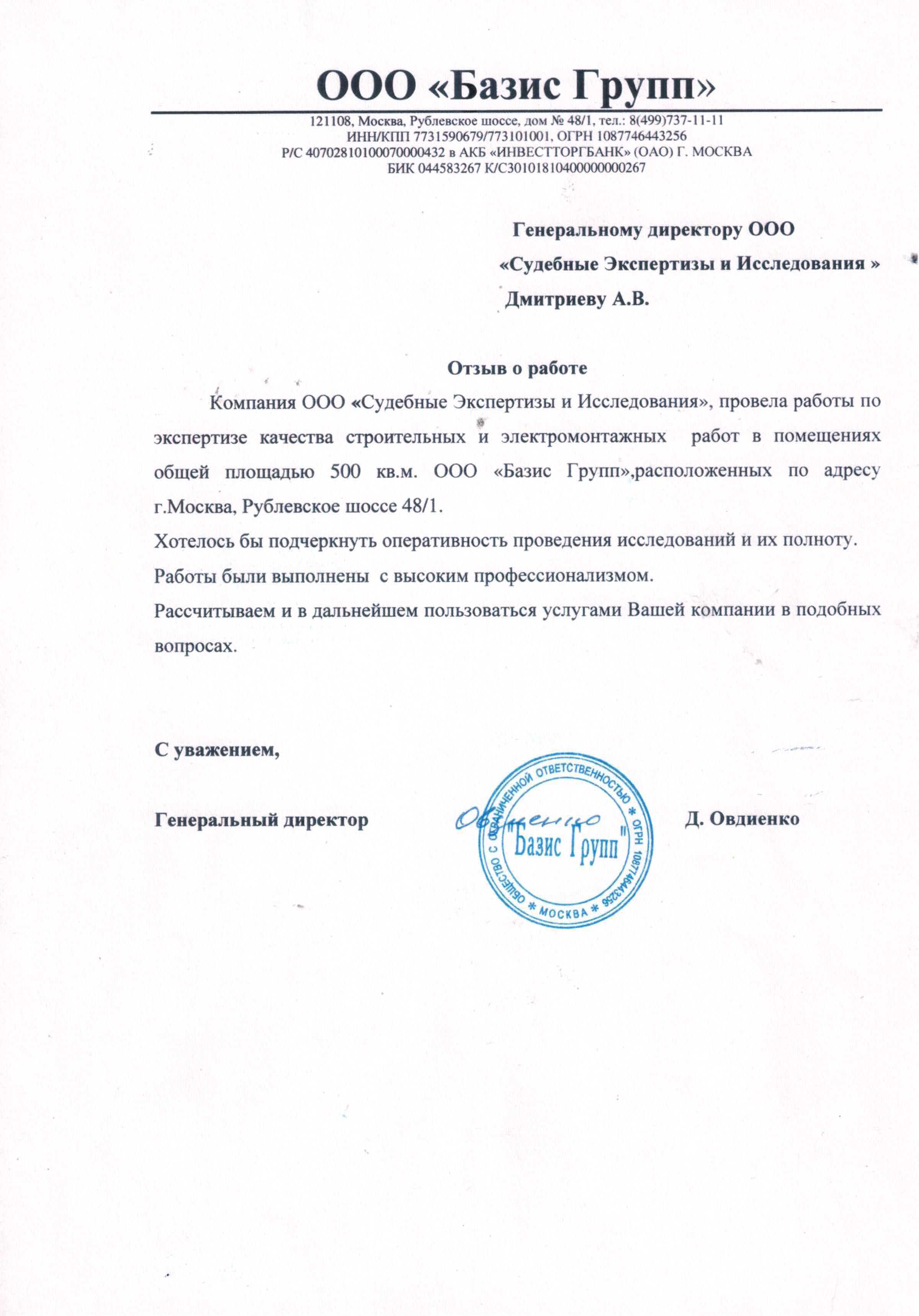 Компания ООО «Судебные Экспертизы и Исследования» провела работы по экспертизе качества строительных и электромонтажных работ в помещениях общей площадью 500 кв.м. ООО «БАЗИС ГРУПП», расположенных по адресу: г. Москва, Рублевское шоссе, д. 48/1. Хотелось бы подчеркнуть оперативность исследований и их полноту. Работы выполнены с высоким профессионализмом. Рассчитываем в дальнейшем пользоваться услугами Вашей компании в подобных вопросах.