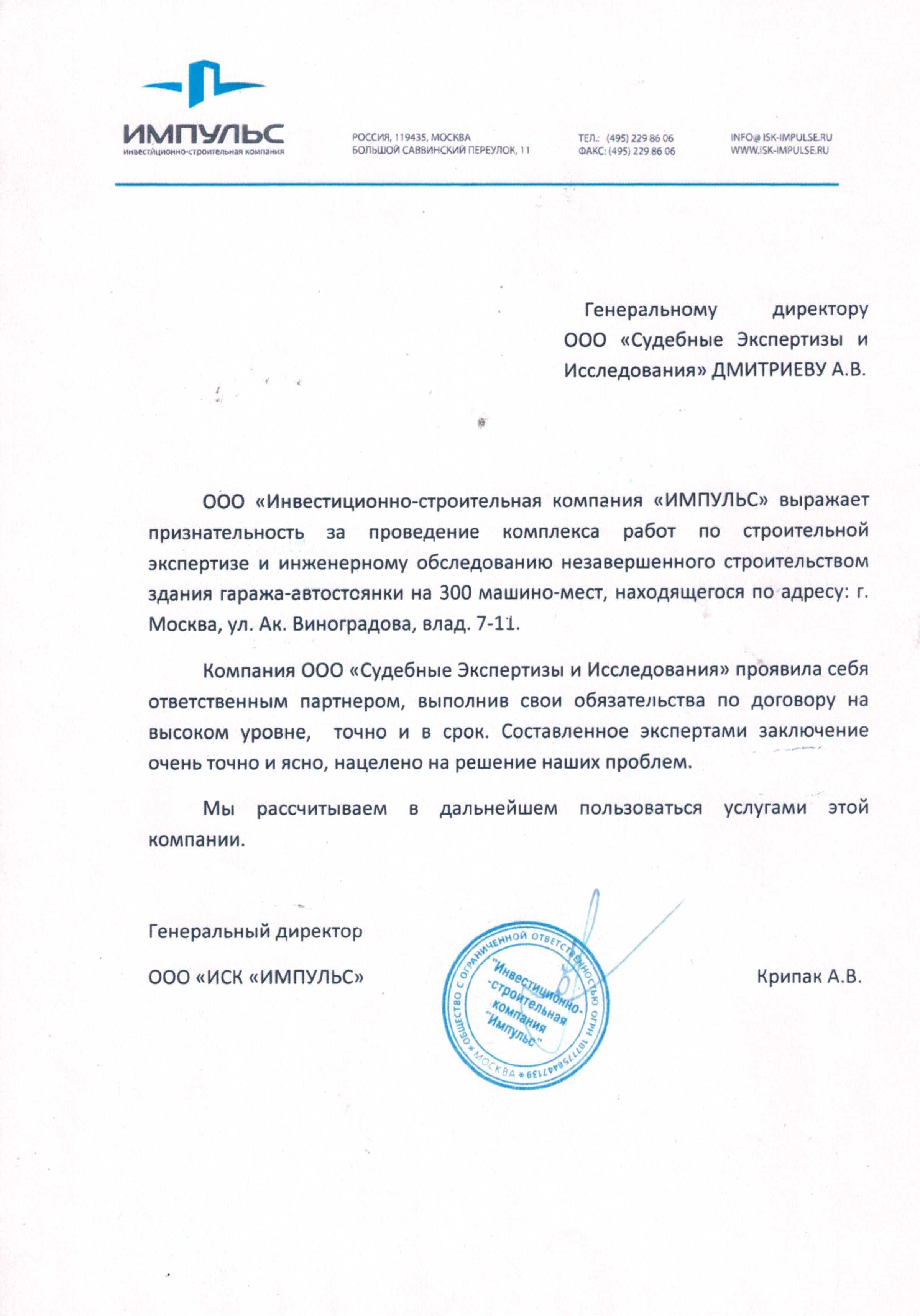 ООО «Инвестиционно-строительная компания «ИМПУЛЬС» выражает признательность за проведение комплекса работ по строительной экспертизе и инженерному обследованию незавершенного строительством здания гаража-автостоянки на 300 машино-мест, находящегося по адресу: г. Москва, ул. Ак. Виноградова, влад. 7-11.