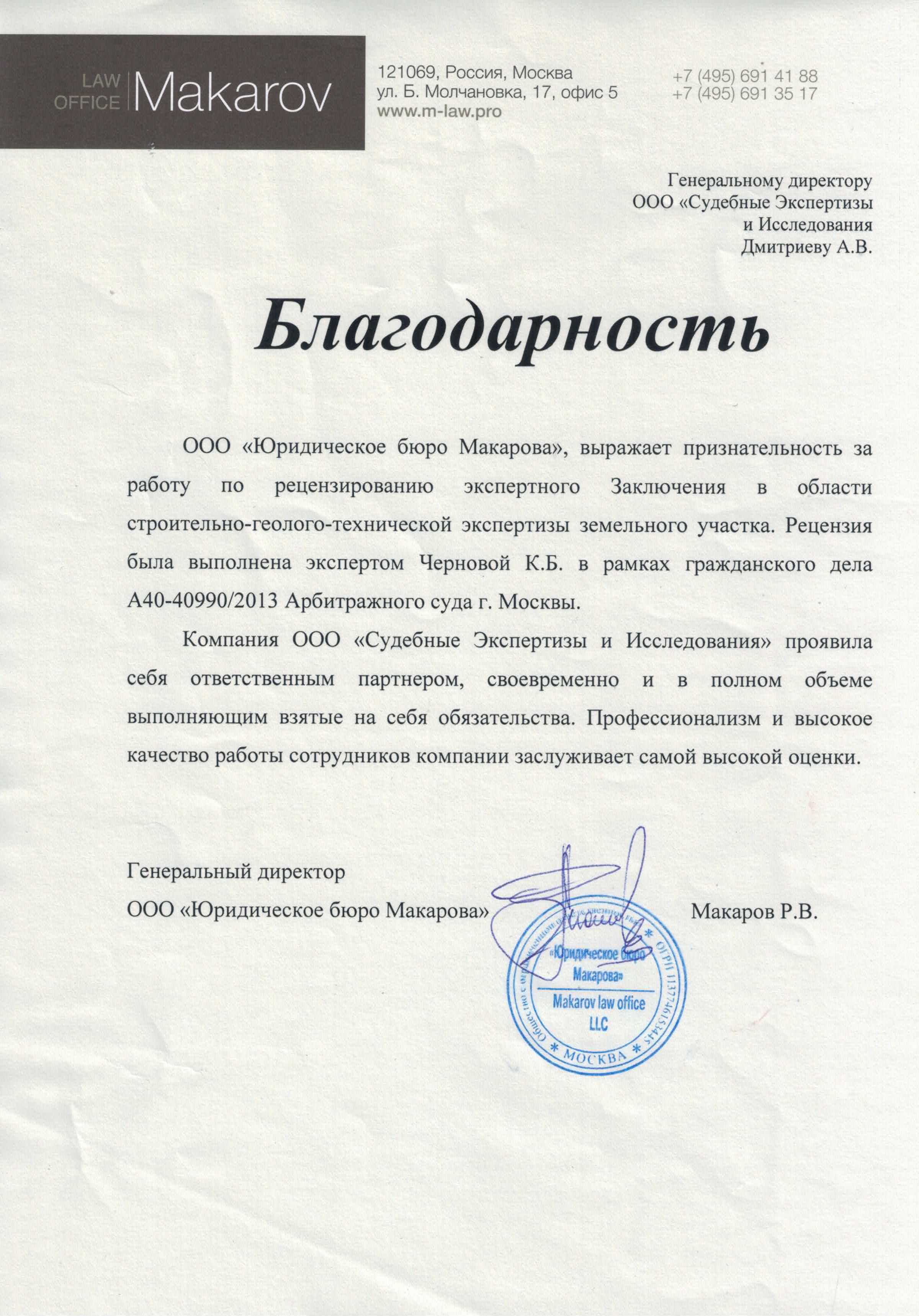 ООО «Юридическое бюро Макарова», выражает признательность за работу по рецензированию экспертного Заключения в области строительно-геолого-технической экспертизы земельного участка. Рецензия была выполнена экспертом Черновой К.Б. в рамках гражданского дела А40-40990/2013 Арбитражного суда г. Москвы. Компания ООО «Судебные Экспертизы и Исследования» проявила себя ответственным партнером, своевременно и в полном объеме выполняющим взятые на себя обязательства. Профессионализм и высокое качество работы сотрудников компании заслуживает самой высокой оценки.