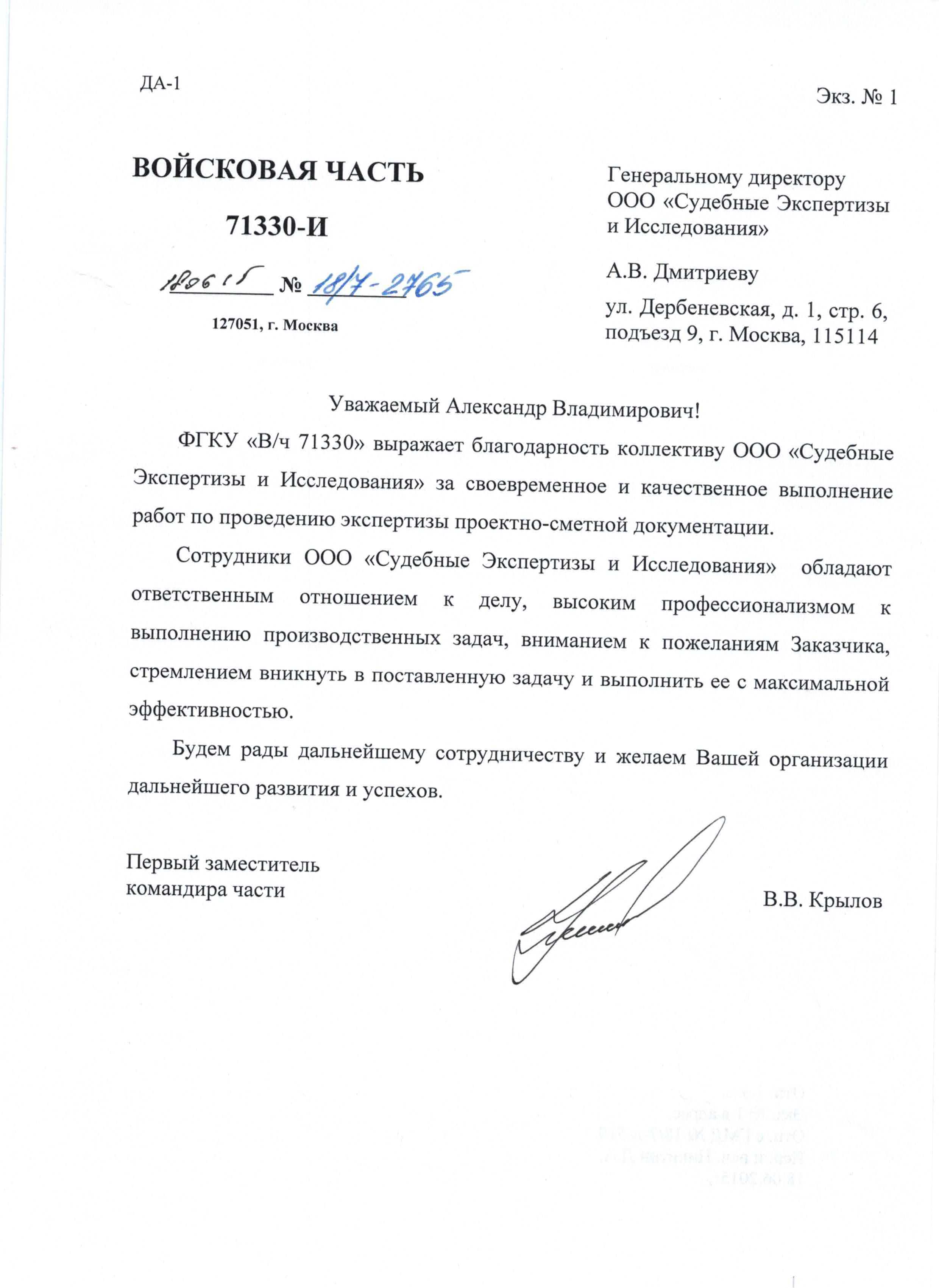ФГКУ «В/ч 71330» выражает благодарность коллективу ООО «Судебные Экспертизы и Исследования» за своевременное и качественное выполнение работ по проведению экспертизы проектно-сметной документации.