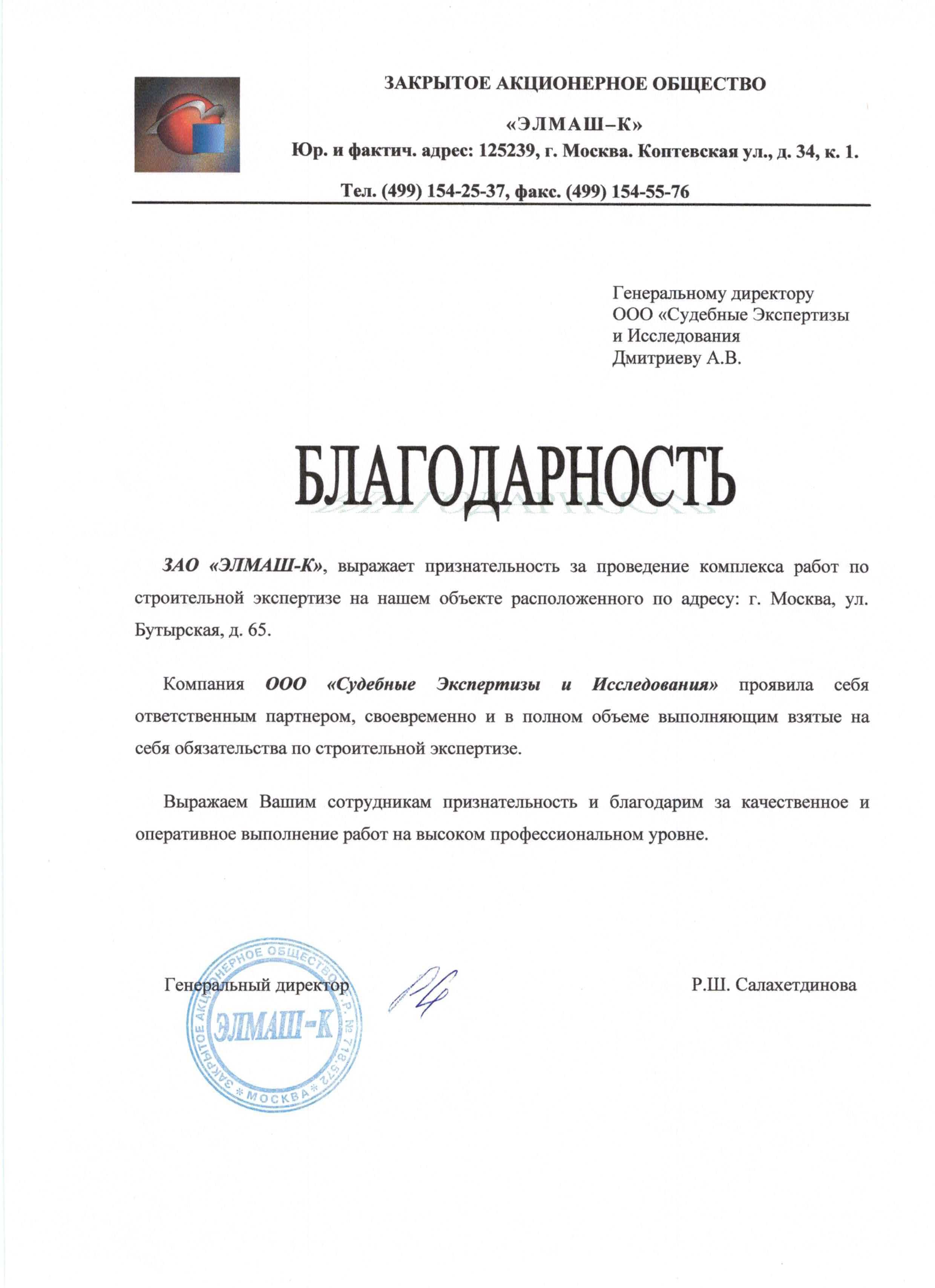 ЗАО «ЭЛМАШ-К», выражает признательность за проведение комплекса работ по строительной экспертизе на нашем объекте, расположенном по адресу: г. Москва, ул. Бутырская, д. 65.